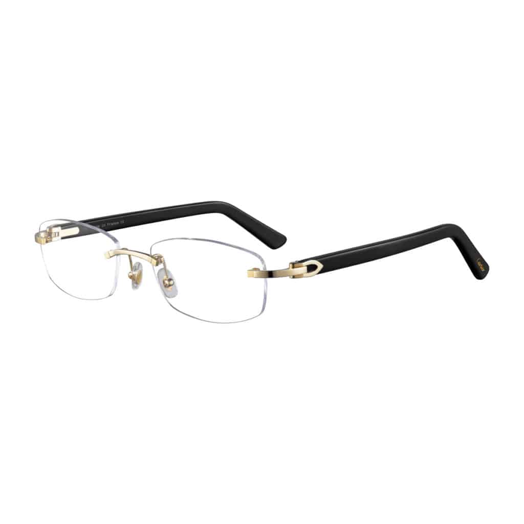 Cartier CT0048O Eyeglasses in a high-rectangular rimless shape enriched by the C Décor on the temples for an elegant clientele. Precious finishes in gold adorning the décor and the metal parts. Temples equipped with flexible hinges for better comfort and fit, enabling the temples to fold back smoothly. Double C Décor signature on the nose pads.