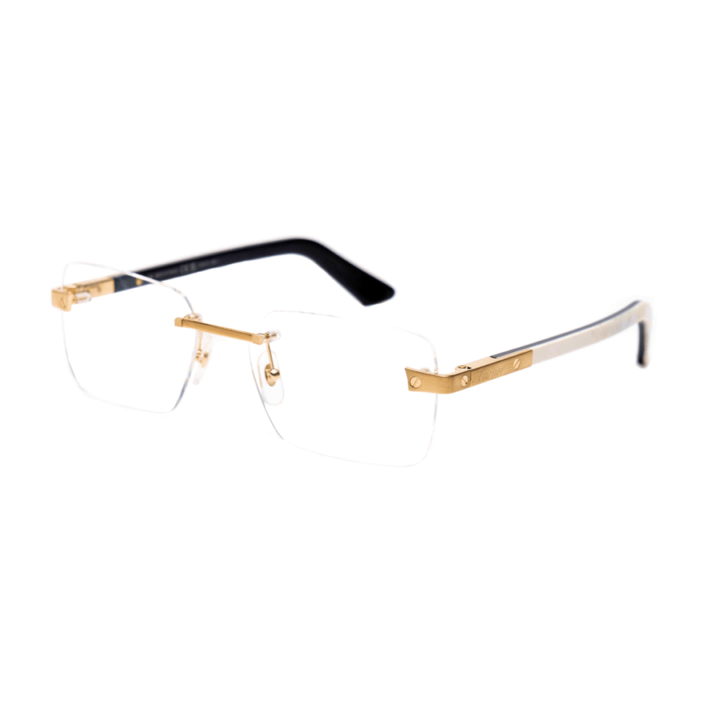 Cartier eyeglasses that are an elevation of Santos de Cartier family with the introduction of Noble Materials. Classic rectangular shape in rimless construction. Full horn or wood temples enriched by the iconic Santos screws on the hinge and on the temple tips. Precious finish in gold and platinum, Cartier logo engraved on temples and screw décor on temple tips.