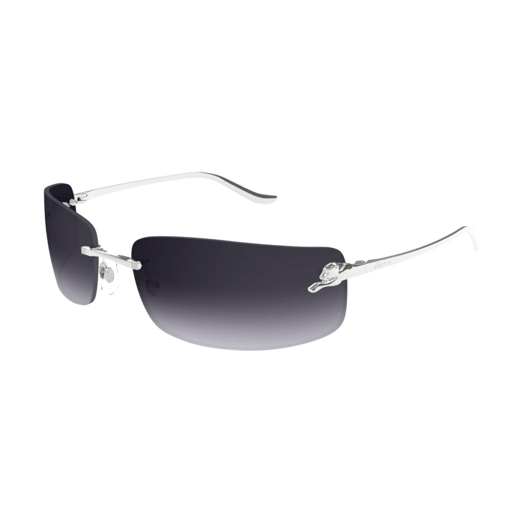 Re-vamped bi-dimensional Panthère frame fully in metal with the Panthère body running along all the temple. Audacious and distinctive wrapped rimless construction for a stylish yet iconic look. Hinge embellished by the iconic Panthère silhouette designed in every details. Precious finish in gold or platinum paired with colourful lenses and Double C Décor on the nose pads.